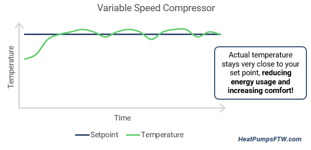 Modern heat pumps use variable speed compressors, which means they do not just cycle on and off around the set point on your thermostat.